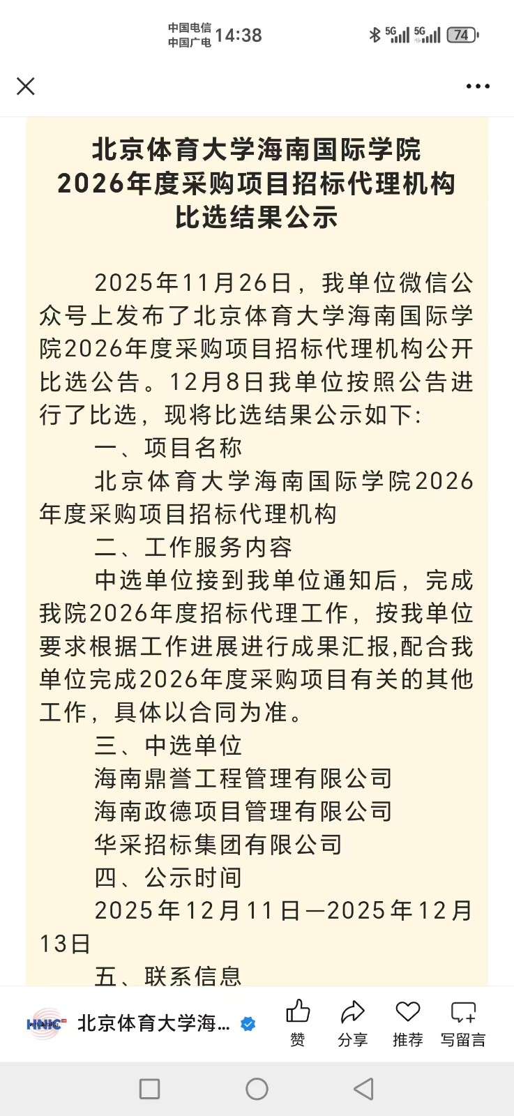 近日,华采招标集团有限公司凭借专业实力与规范服务,先后成功入围北京师范大学、中央戏剧学院、北京体育大学海南国际学院、琼台师范学院等四家高校,以及北京市西城区展览路街道、海南省第三人民医院、海南省老年病医院三家政企医疗单位的招标代理机构库,实现多领域业务拓展新突破。